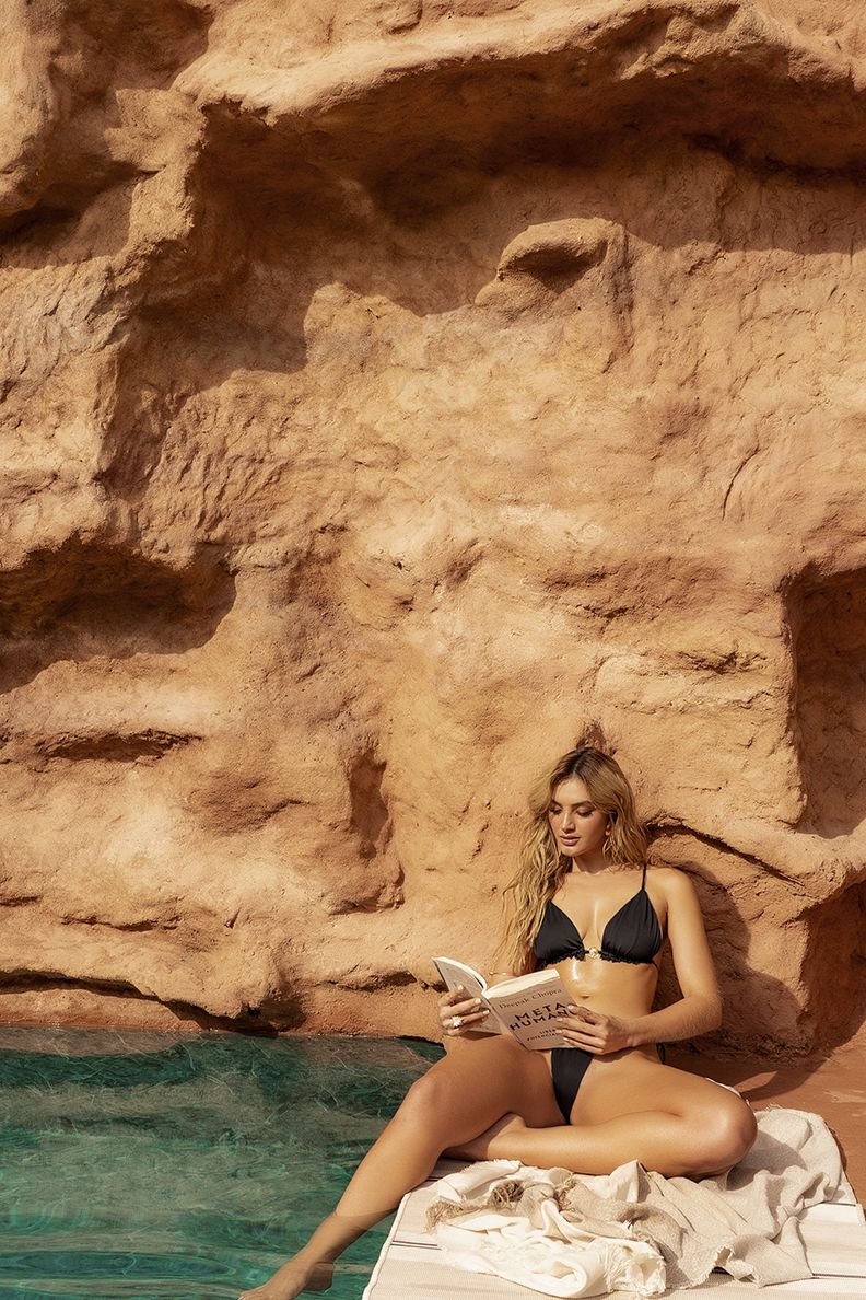 Turn heads in this black triangle string bikini set with bold, luxe details. The top features a flattering gathered fit with a gold-tone center charm, while the back shows off a sleek crisscross strappy design for an elevated, fashion-forward finish. The matching side-tie bottom is accented with gold-tone rings and a minimal cut that's perfect for tanning and confident beach days.