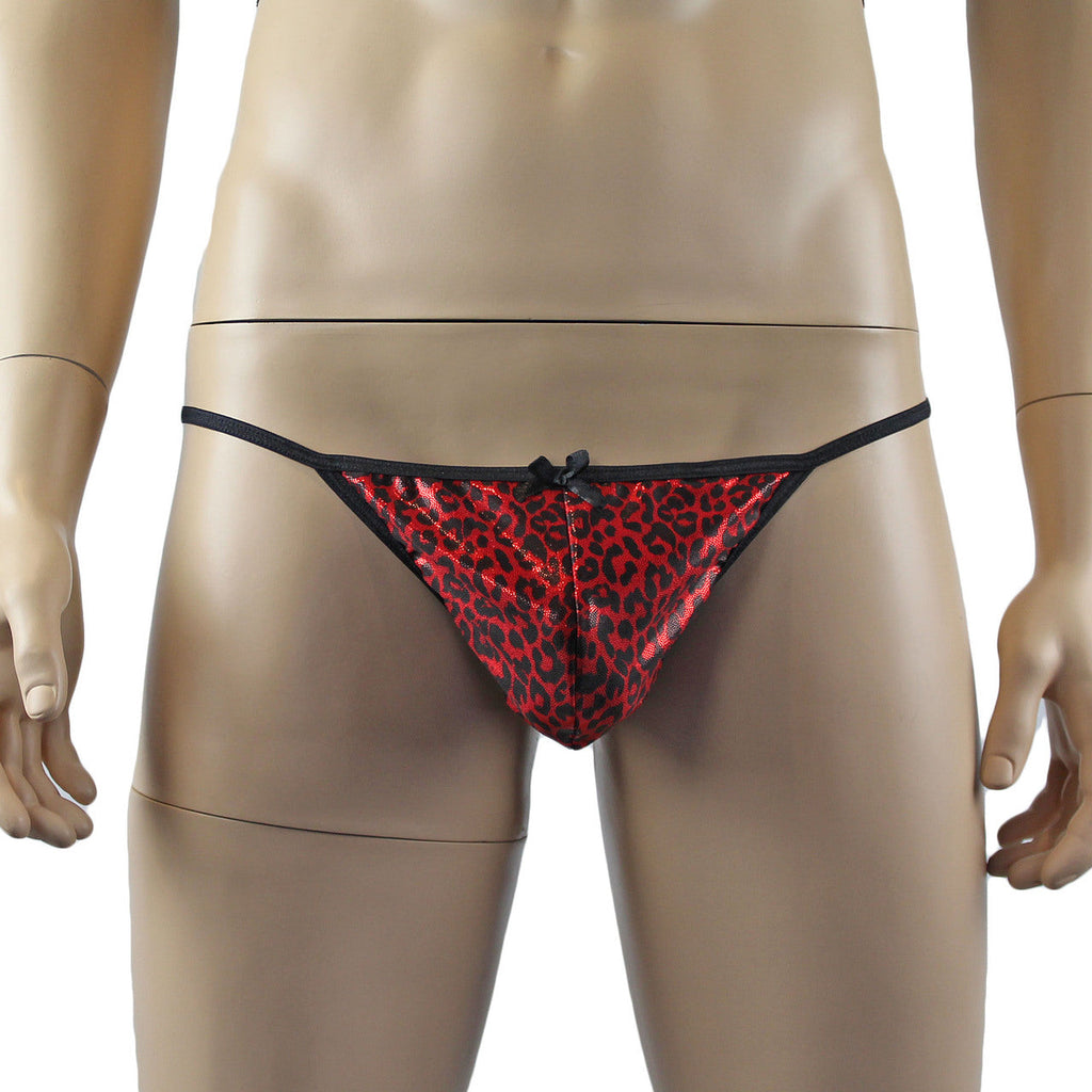 Mens Lingerie stretch leopard print dazzle pouch G string with thin elastic back and waistband, has satin bow front