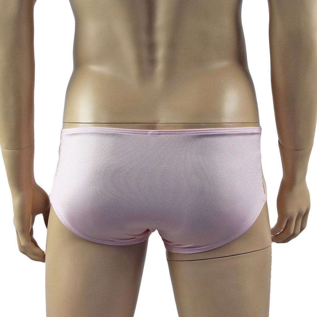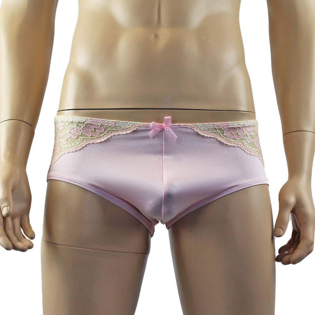Mens stretch soft milliskin spandex Bra Top with beautiful floral lace trim, has adjustable shoulder straps with metal adjusters and a satin bow on the front. Easy to step into or put on over your head. Comes with matching Boxer Brief with floral lace on the front and has a satin bow front