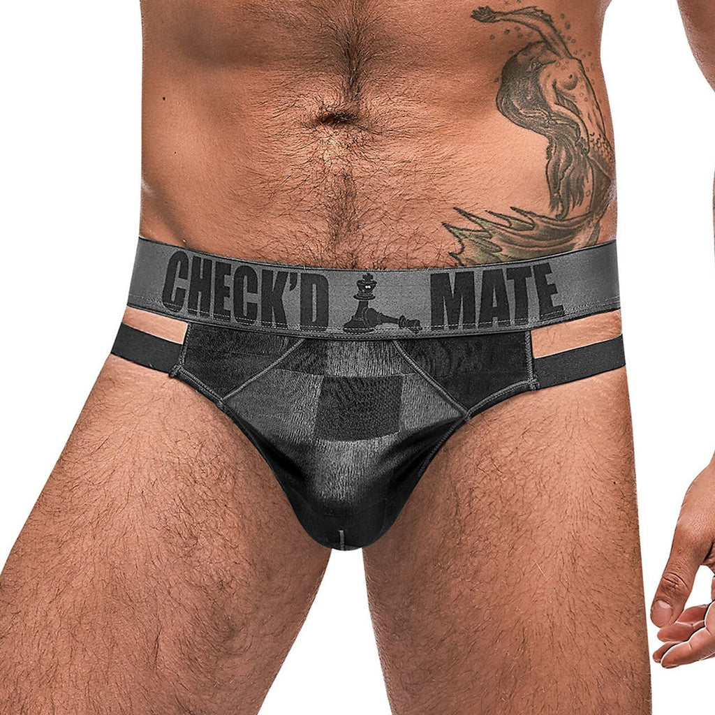 From the Checked Mate collection by Male Power, this style includes: A thong with a sheer tone on tone checker board pattern featuring attention-grabbing cutout windows on the hips, tone on tone decorative stitching with a plush elastic trim, and playful characters that adorn the plush elastic waistband.