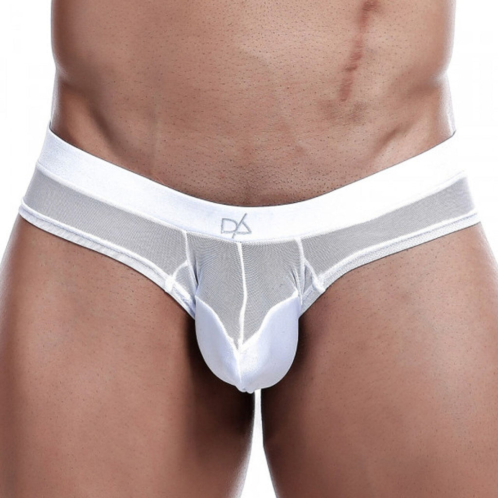 Mens stretch sheer see through mesh Thong with contoured pouch front in spandex and peek a boo mesh, has a spandex waistband
