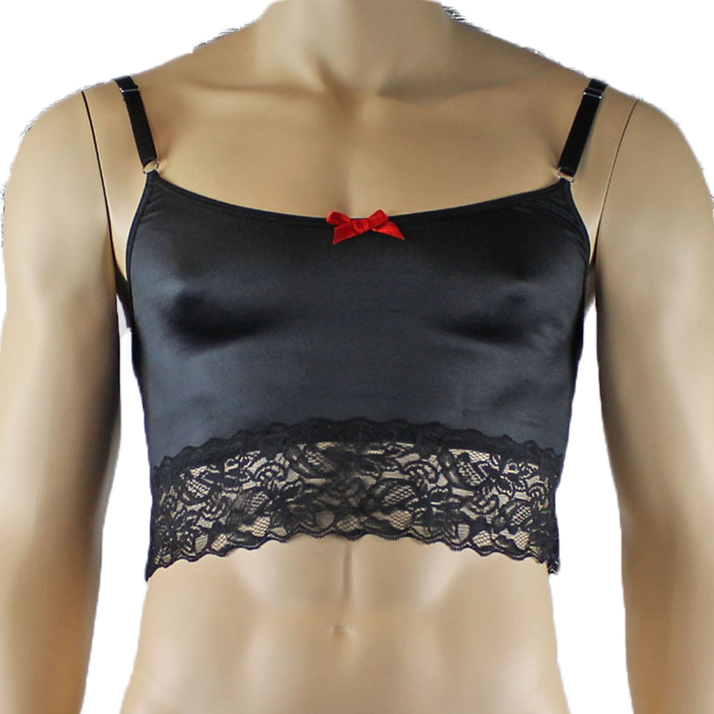 Mens stretch satin spandex lycra with floral stretch lace Crop Cami Top, has adjustable shoulder straps, sexy and feminine